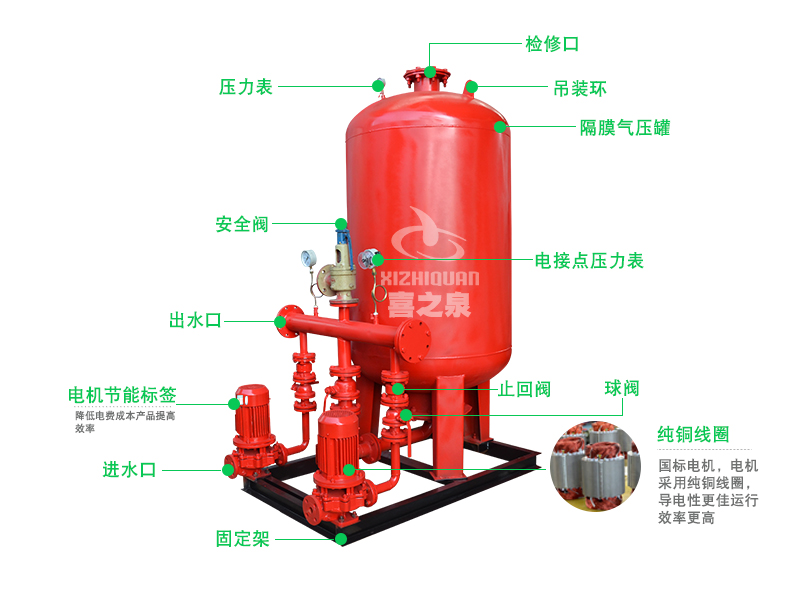 消防自動增壓穩壓給水成套設備是為消防滅火工程配套的設備,主要作用:保持水滅火管網的消防壓力,發生火警打開水滅火設備能立即噴出充實水柱,給報警聯動啟動大消防泵贏得30秒以上的初期滅火撲救時間,直至消防主泵全負荷啟動進行,由于該設備能始終保持管網壓力,使管網不存空氣啟動大消防泵不打嗆管網無顫動危險。并獲得消防產品3CF認證證書。
