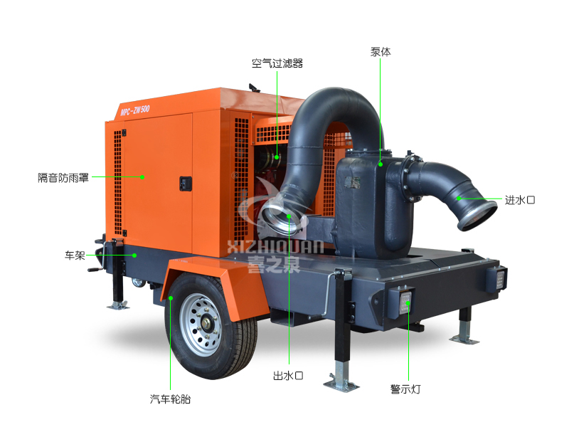 2.單級式移動泵車主要由真空輔助裝置、柴油機動力包、柴油機專用油箱、泵傳動系統、設備底座、自吸泵總成、防雨設施、起動裝置、起動電源裝置、進水管總成、出水管總成、二輪移動拖車系統、快速起吊裝置等組成。