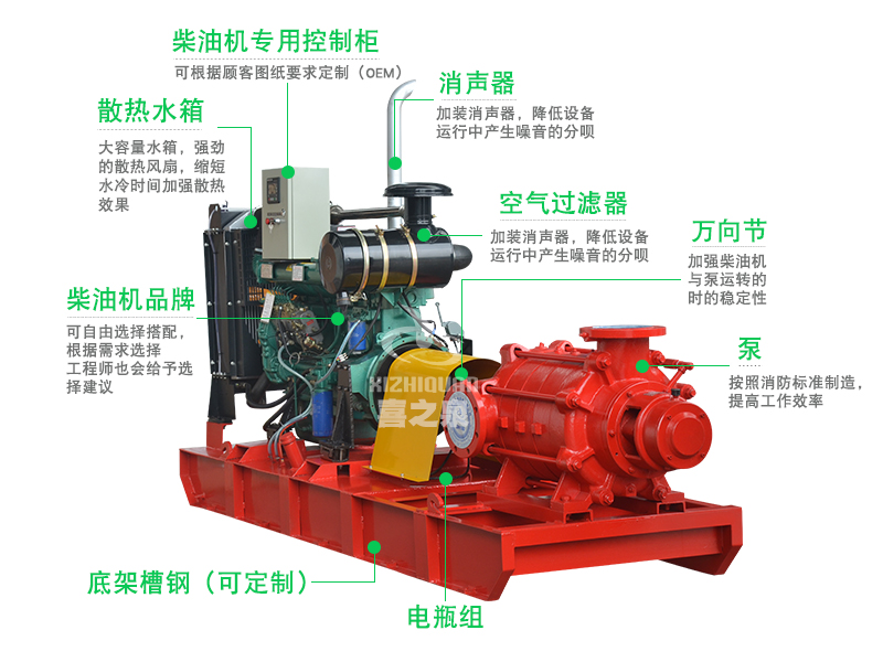 4.柴油機消防泵可與電動泵組、穩壓泵等組成自動消防給水系統。