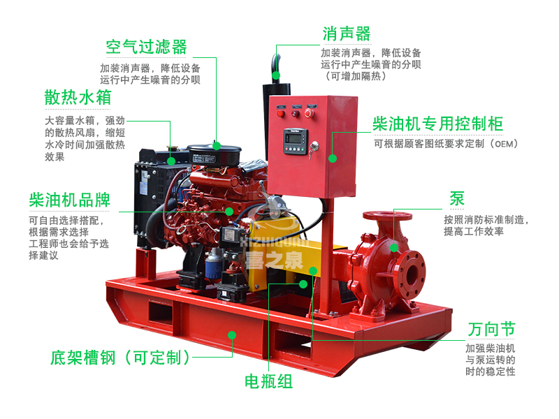 柴油機消防泵,柴油水泵機組接到火警/管網壓力/停電/或其他啟動信號后,在15秒內能自動起動并投入滿負荷運行