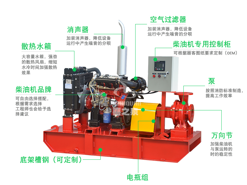 柴油機均采用國產或產品,具有啟動特性好、過載能力強、結構緊湊、維修方便、使用簡單、自動化程度高等特點,是一種先進、性能可靠的消防設備