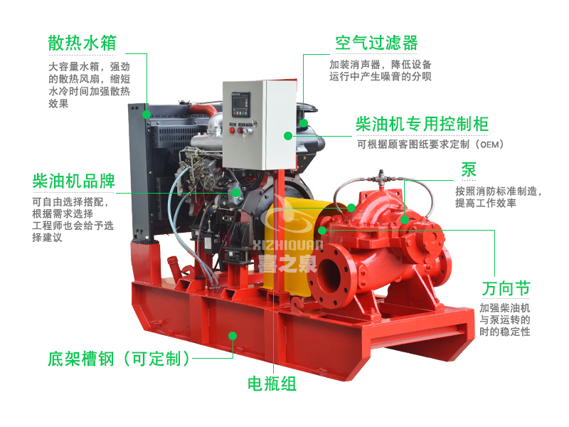 XBC-S柴油機消防泵組是上海喜之泉泵閥有限公司嚴格安裝標準GB6245消防泵性能要求和試驗方法等標準研制開發(fā)的一種新型消防設備,該系列設備按所配用的消防泵(單級單吸式、單級雙吸式、節(jié)段多級式)可分為XBC-IS、XBC-S、XBC-D等三個子系列,設備壓力、流量范圍廣,其應用幾乎能滿足消防所需的各種場合。設備所配柴油機均采用國產(chǎn)或產(chǎn)品,具有啟動特性好、過載能力強、結構緊湊、維修方便、使用簡單、自動化程度高等特點,是一種先進、性能可靠的消防設備。并獲得消防產(chǎn)品3CF認證證書。