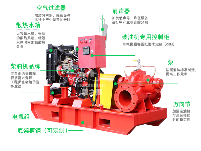 柴油機消防泵組嚴格按照標準GB6245,設備所配柴油機均采用國產或進口產品,具有啟動特性好、過載能力強、結構緊湊、維修方便、使用簡單、自動化程度高等特點