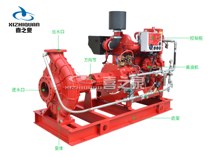 11、柴油機消防泵可與電動泵組、穩(wěn)壓泵等組成自動消防給水系統(tǒng)。
